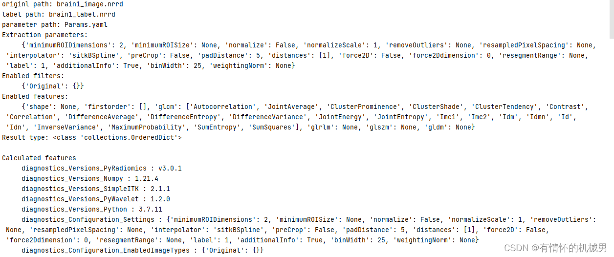 【影像组学pyradiomics教程】 (二) pyradiomics 使用示例_JianJuly的博客-CSDN博客_pyradiomics的应用本系列博客后续将更新于个人微信公众号,欢迎关注。测试用的图片:pyradiomics\data\brain1_image.nrrd 和 pyradiomics\data\brain1_label.nrrd’测试用的配置文件:pyradiomics\examples\exampleSettings\Params.yaml测试文...https://blog.csdn.net/JianJuly/article/details/79017272