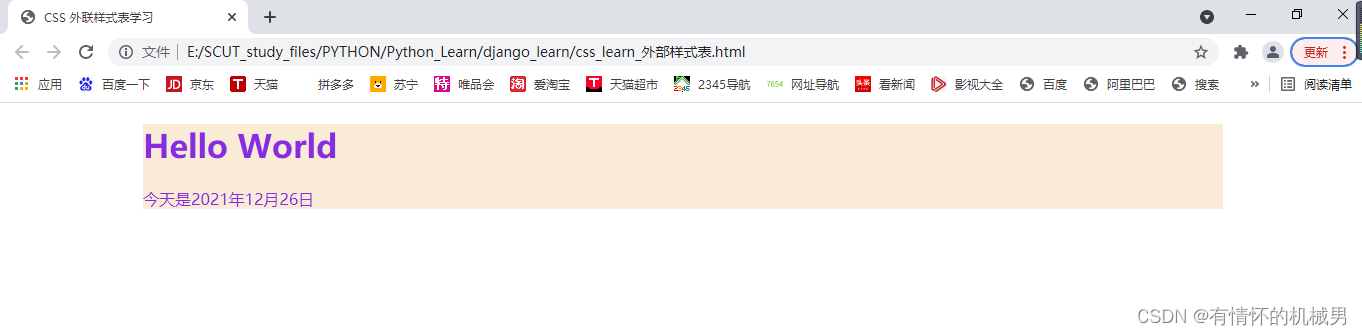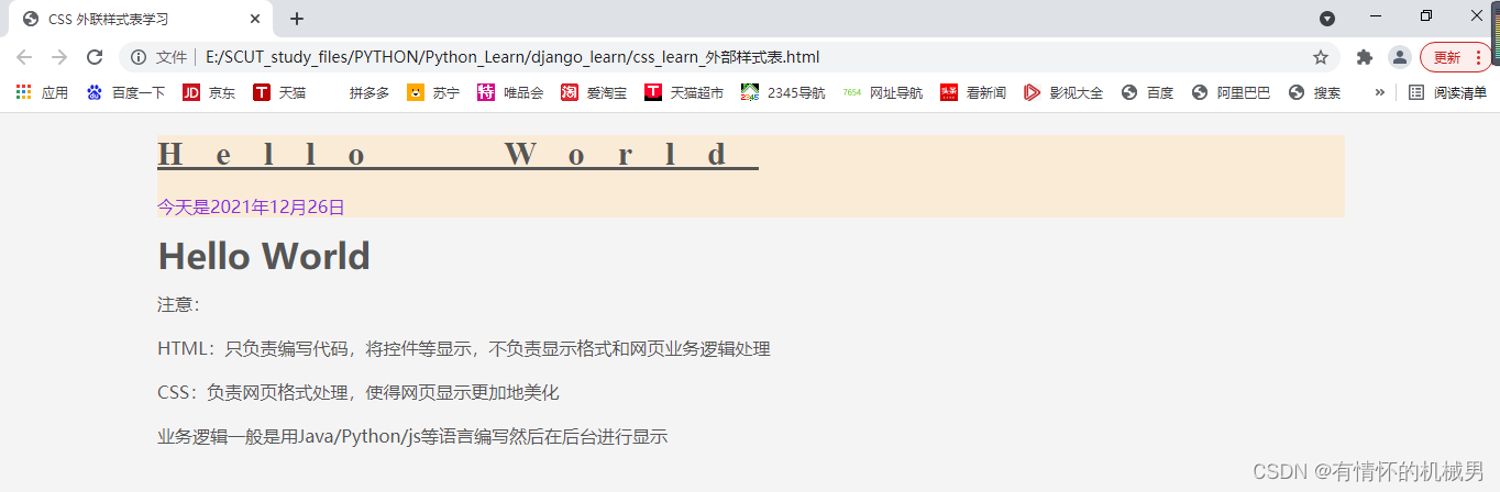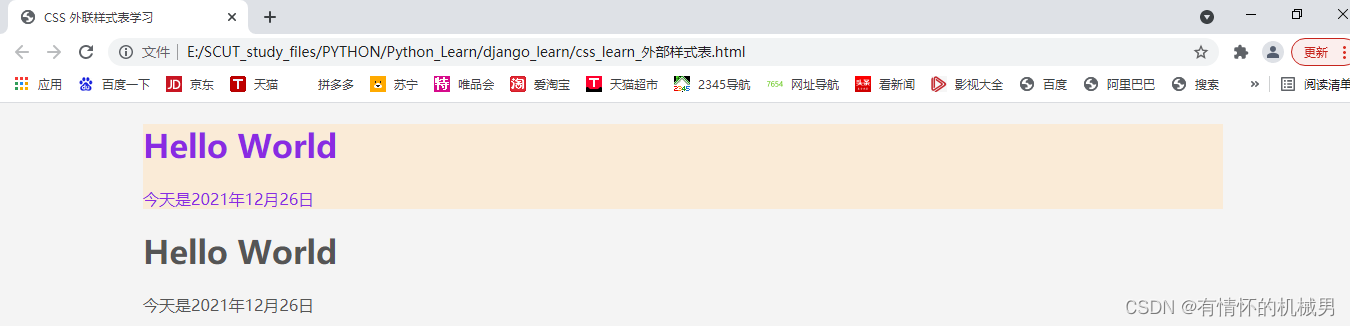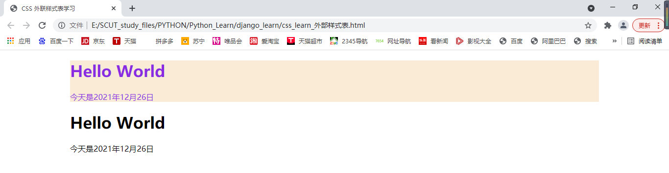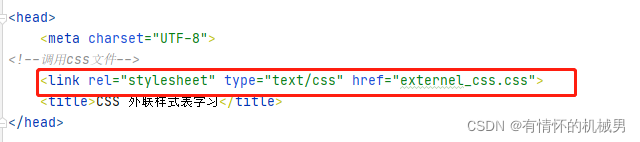 <!--调用css文件--><link rel="stylesheet" type="text/css" href="externel_css.css"><title>CSS 外联样式表学习</title>