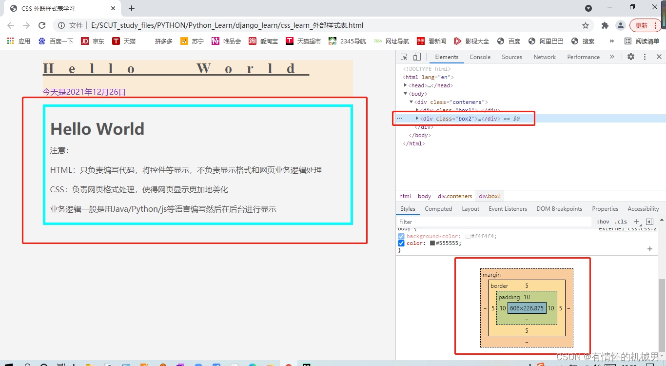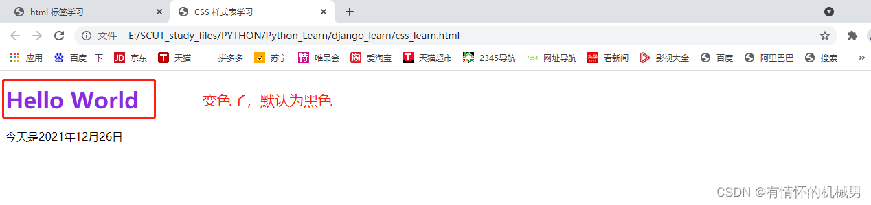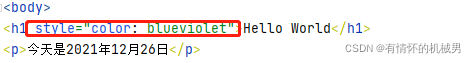 <div class="conteners"><div class="box1"><h1>Hello World</h1><p>今天是2021年12月26日</p></div>