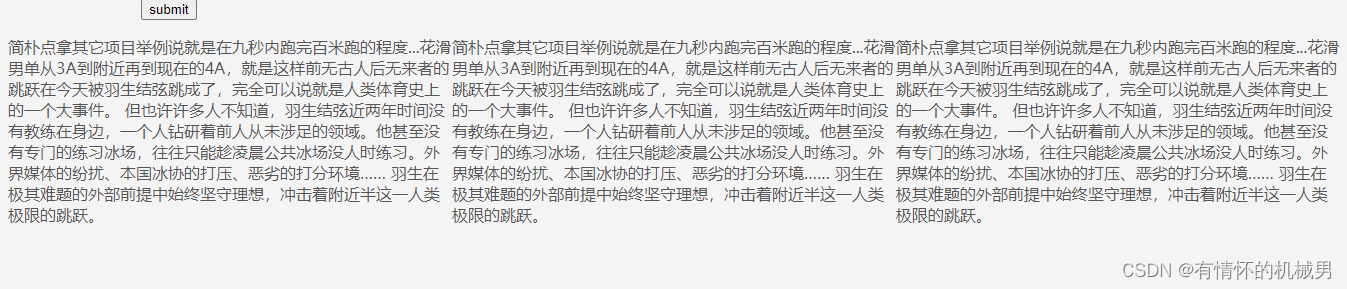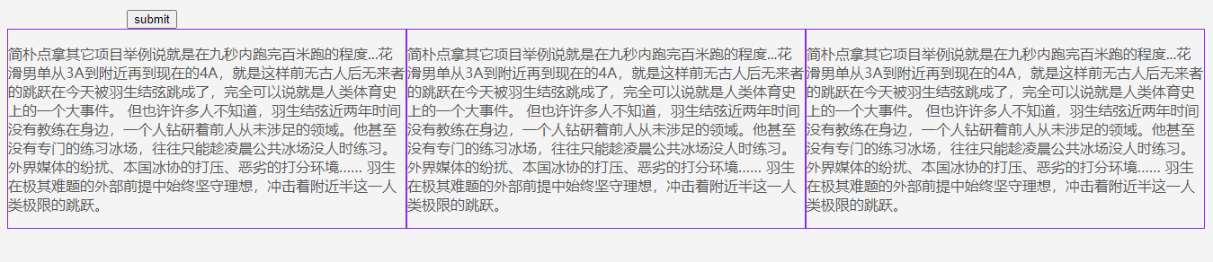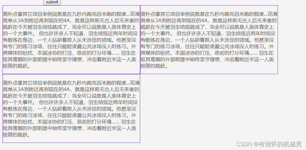 .block{/*设置盒子对齐的方式*/float: left;/*三联的宽度比例*/width: 33.3%;/*设置边框属性*/border: blueviolet 1px solid;/*使得边框粗细不会占据网页大小,这样就不会因为边框的原因而导致三联不正常显示*/box-sizing: border-box;