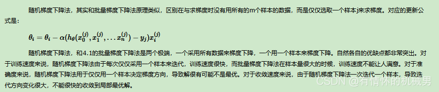 优点:随机梯度下降就是BGD的极端,只是随机选择一个样本的梯度来指导梯度的下降,因为使用了一个样本,因此其训练速度会很快