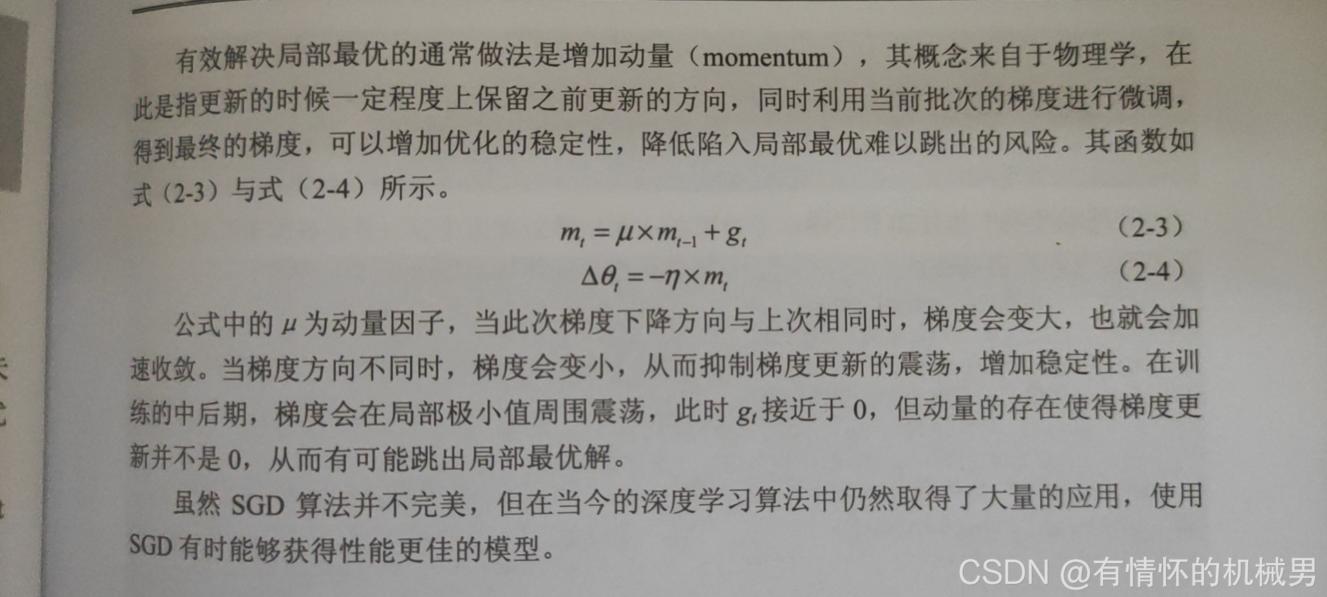 Momentum算法是在MBGD的基础上进行了修改,即在梯度方向上增加动量(Momentum),意思指在更新梯度时,会保留之前更新的梯度方向,然后利用当前批次的梯度进行微调