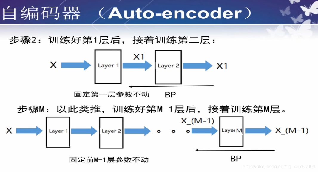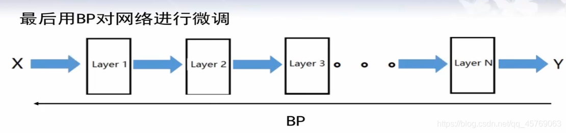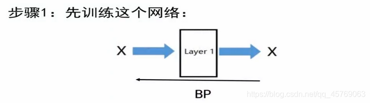 假设训练一个输入为X,输出为Y,神经网络层数为N层的网络,对于每一层的参数逐层进行训练。通过假设每一层的输入和输出是一样的,并且保持前面神经网络层的参数不变,利用BP算法对该层进行训练,这样的话就得到了该层的参数的初始值