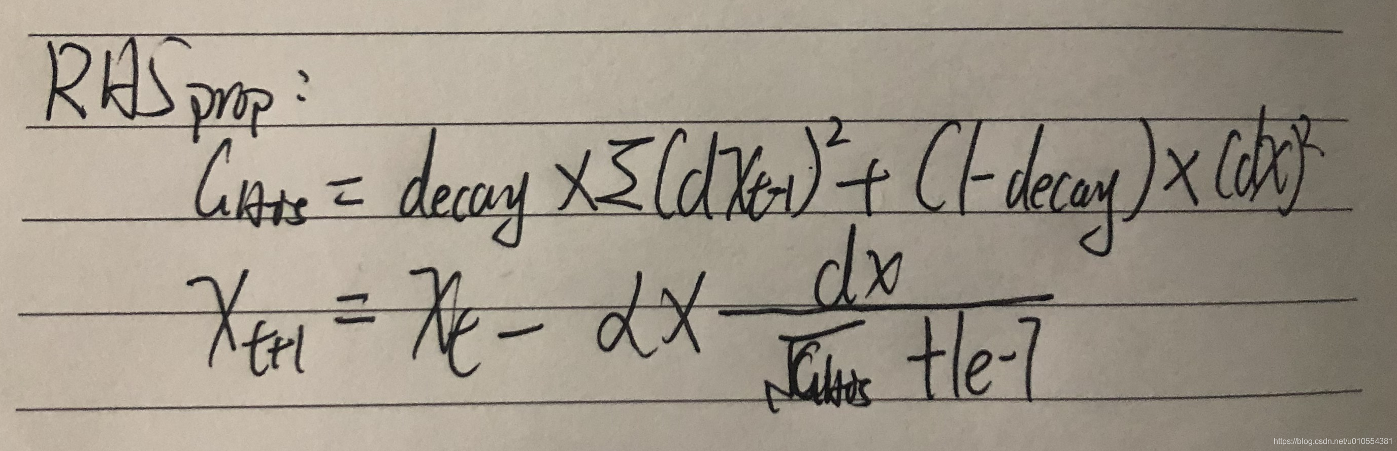 RMSprop是由AdaGrad改进而来的,因为在遭遇数据量非常大的数据集进行训练时,AdaGrad函数的Ghis项会越来越庞大,导致训练速度变慢以及其他的问题,所以加入decay的存在,该decay是历史数据对Ghis的权重。