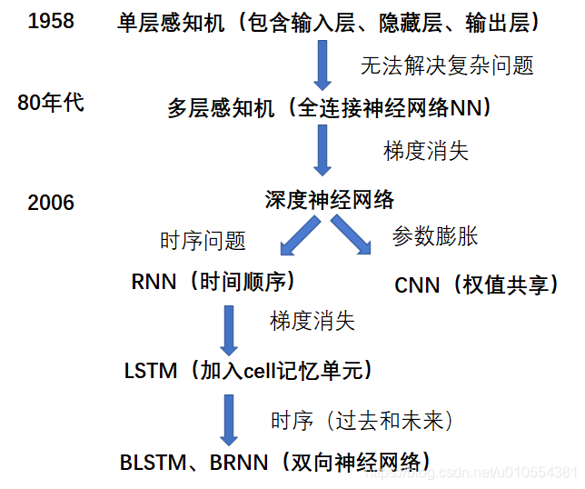 再后来,由于图像处理等需要局部的信息,这时引入卷积核和max-pooling等操作来解决相应的问题,所以产生了CNN;与此同时,由于要解决时序的问题,产生了RNN,后期的LSTM等都是RNN为解决时间上的梯度消失而生成的网络。