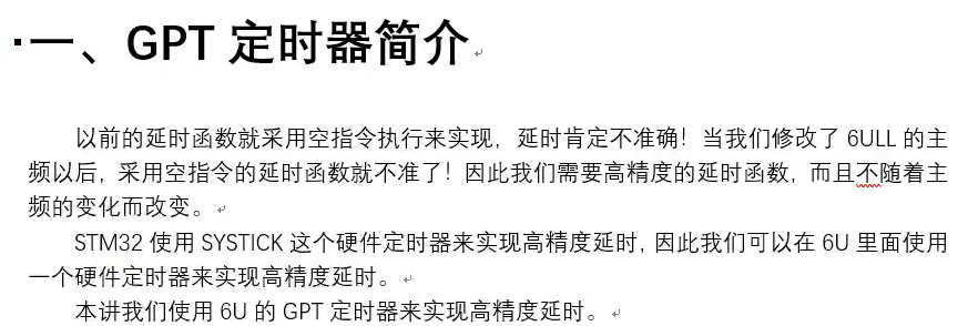 {unsigned long oldcnt,newcnt;unsigned long tcntvalue = 0; /* 走过的总时间 */oldcnt = GPT1->CNT;while(1){newcnt = GPT1->CNT;if(newcnt != oldcnt){if(newcnt > oldcnt) /* GPT是向上计数器,并且没有溢出 */tcntvalue += newcnt - oldcnt;//统计时间差else /* 发生溢出 */tcntvalue += 0XFFFFFFFF-oldcnt + newcnt;oldcnt = newcnt;if(tcntvalue >= usdelay)/* 延时时间到了 */break; /* 跳出 */}}