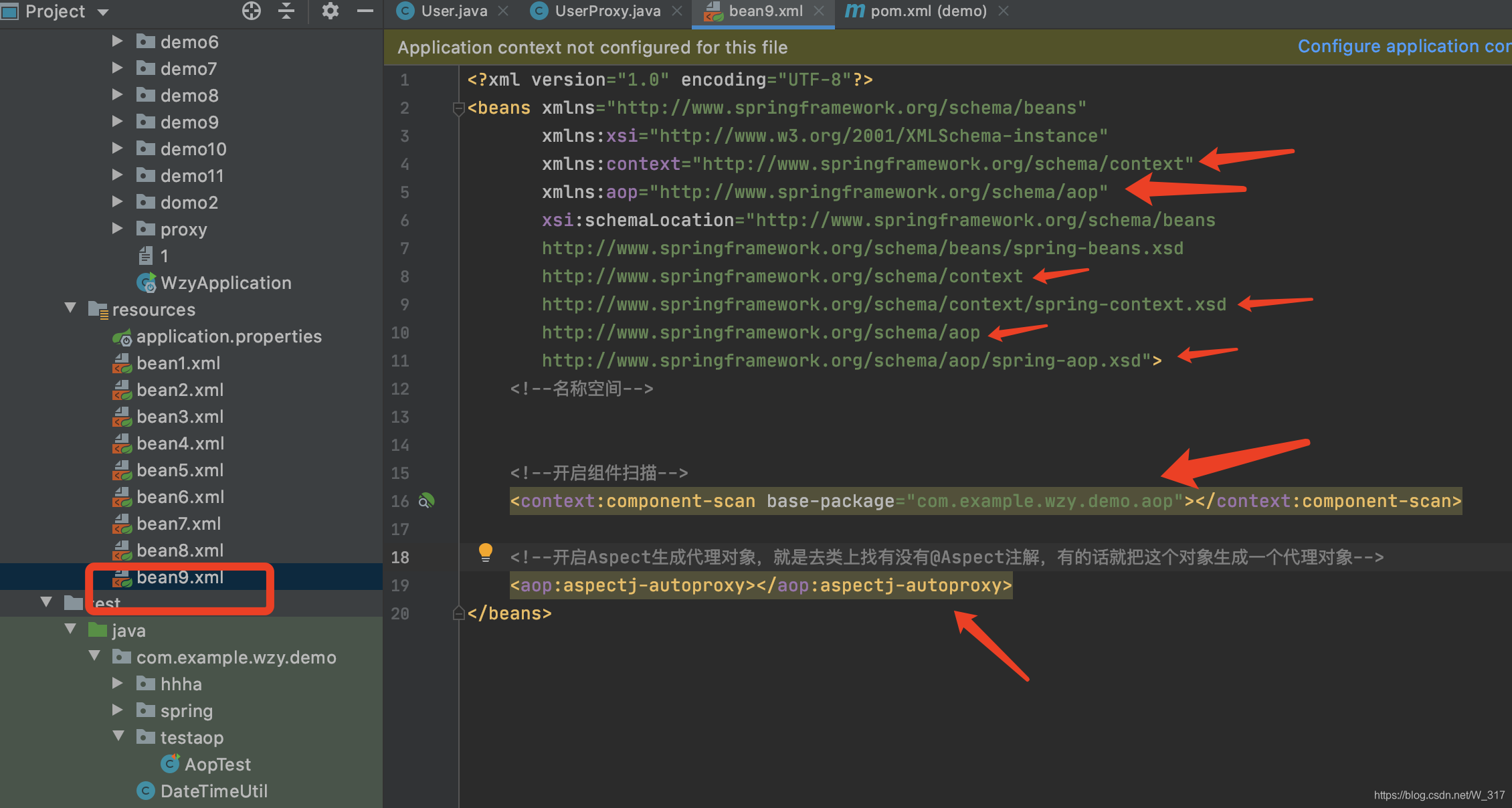 <beans xmlns="http://www.springframework.org/schema/beans"xmlns:xsi="http://www.w3.org/2001/XMLSchema-instance"xmlns:context="http://www.springframework.org/schema/context"xmlns:aop="http://www.springframework.org/schema/aop"xsi:schemaLocation="http://www.springframework.org/schema/beanshttp://www.springframework.org/schema/beans/spring-beans.xsdhttp://www.springframework.org/schema/contexthttp://www.springframework.org/schema/context/spring-context.xsdhttp://www.springframework.org/schema/aophttp://www.springframework.org/schema/aop/spring-aop.xsd"><!--名称空间--><!--创建对象--><bean id="book" class="com.example.wzy.demo.aopxml.Book"></bean><bean id="bookProxy" class="com.example.wzy.demo.aopxml.BookProxy"></bean><!--配置aop增强--><aop:config><!--切入点--><aop:pointcut id="p" expression="execution(* com.example.wzy.demo.aopxml.Book.buy(..))"/><!--配置切面--><aop:aspect ref="bookProxy"><!--增强作用在具体的方法上--><aop:before method="before" pointcut-ref="p"/></aop:aspect></aop:config>