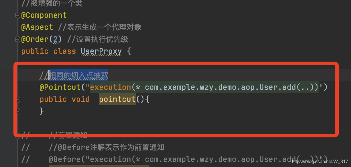 public class UserProxy {//前置通知//@Before注解表示作为前置通知@Before("execution(* com.example.wzy.demo.aop.User.add(..))")public void before(){System.out.println("before方法");}