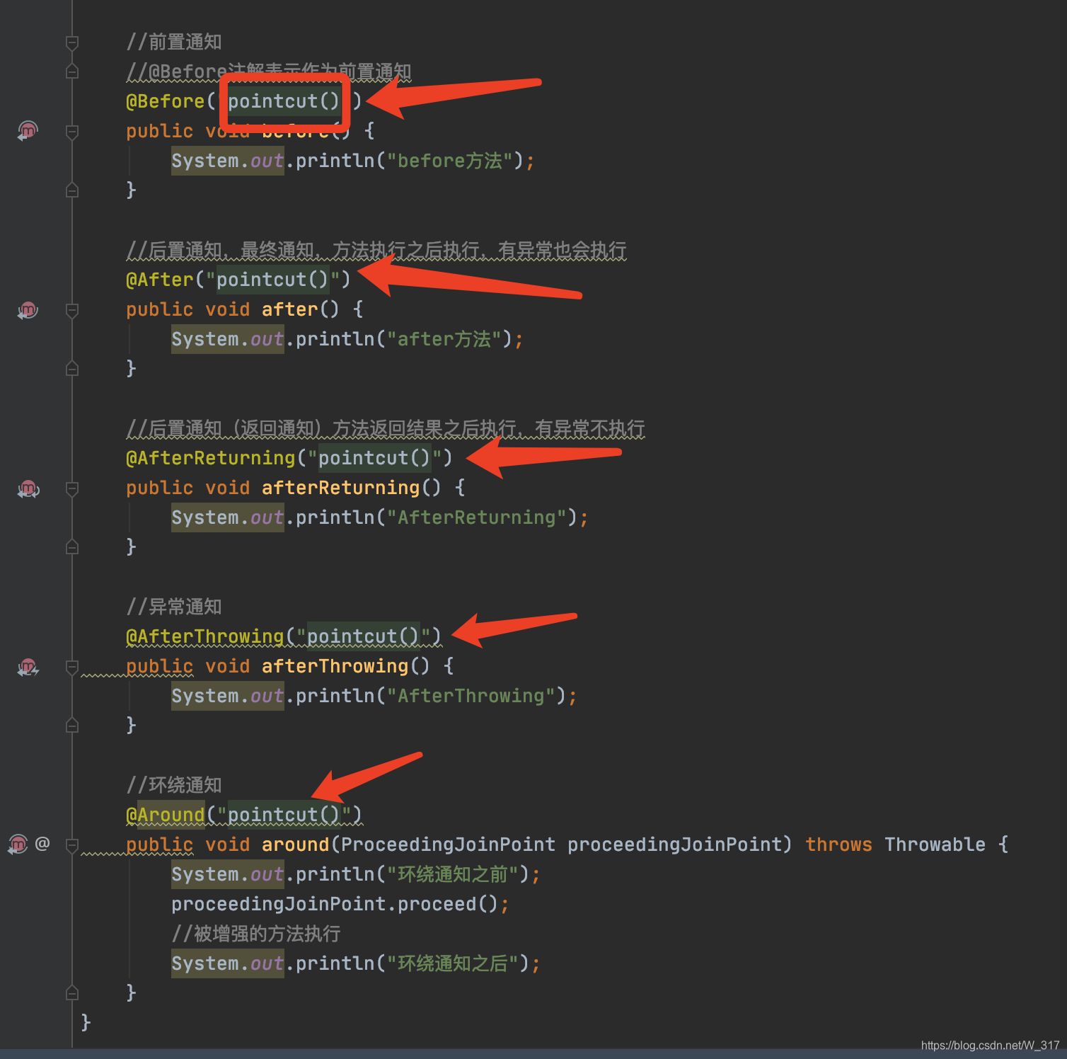 public class UserProxy {//前置通知//@Before注解表示作为前置通知@Before("execution(* com.example.wzy.demo.aop.User.add(..))")public void before() {System.out.println("before方法");}//后置通知,最终通知,方法执行之后执行,有异常也会执行@After("execution(* com.example.wzy.demo.aop.User.add(..))")public void after() {System.out.println("after方法");}//后置通知(返回通知)方法返回结果之后执行,有异常不执行@AfterReturning("execution(* com.example.wzy.demo.aop.User.add(..))")public void afterReturning() {System.out.println("AfterReturning");}//异常通知@AfterThrowing("execution(* com.example.wzy.demo.aop.User.add(..))")public void afterThrowing() {System.out.println("AfterThrowing");}//环绕通知@Around("execution(* com.example.wzy.demo.aop.User.add(..))")public void around(ProceedingJoinPoint proceedingJoinPoint) throws Throwable {System.out.println("环绕通知之前");proceedingJoinPoint.proceed();//被增强的方法执行System.out.println("环绕通知之后");}