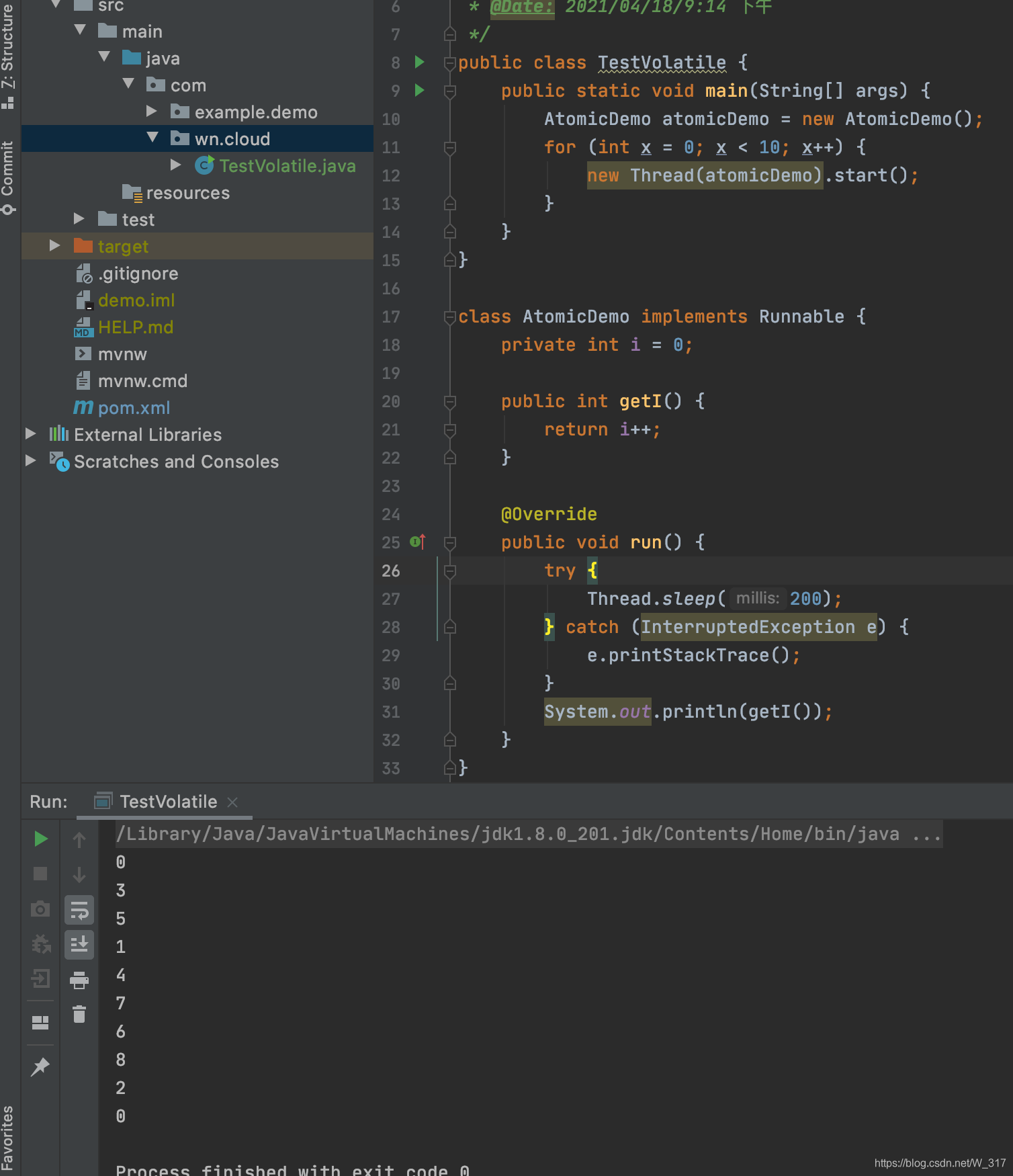 }class AtomicDemo implements Runnable {private int i = 0;public int getI() {return i++;}@Overridepublic void run() {try {Thread.sleep(200);} catch (InterruptedException e) {e.printStackTrace();}System.out.println(getI());}