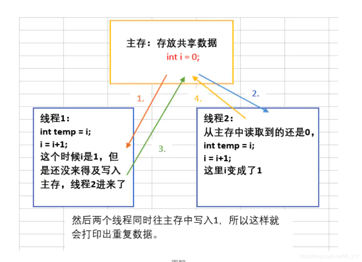 可以发现,出现了重复数据。明显产生了多线程安全问题,或者说原子性问题。所谓原子性就是操作不可再细分,而i++操作分为读改写三步,如下: