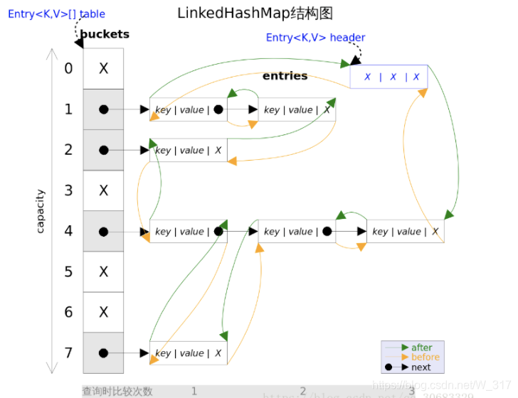 仔细看,这里虽然在计算hashcode时还是发生了hash冲突,采用了链地址法解决了冲突,但是这里的Entry对象是采用双向链表保存的,每个Entry都有一个after和before的属性。当插入一个entry时,如果发生了冲突,就可以将新的Entry插入Entry链表中的头部,但是按照双向链表的角度来说,又会将该Entry插入到双向链表的尾部。