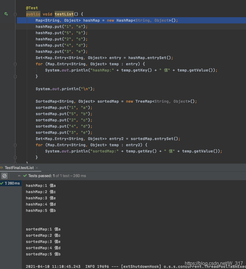 Map<String, Object> hashMap = new HashMap<String, Object>();hashMap.put("1", "a");hashMap.put("5", "b");hashMap.put("2", "c");hashMap.put("4", "d");hashMap.put("3", "e");Set<Map.Entry<String, Object>> entry = hashMap.entrySet();for (Map.Entry<String, Object> temp : entry) {System.out.println("hashMap:" + temp.getKey() + " 值" + temp.getValue());}System.out.println("\n");SortedMap<String, Object> sortedMap = new TreeMap<String, Object>();sortedMap.put("1", "a");sortedMap.put("5", "b");sortedMap.put("2", "c");sortedMap.put("4", "d");sortedMap.put("3", "e");Set<Map.Entry<String, Object>> entry2 = sortedMap.entrySet();for (Map.Entry<String, Object> temp : entry2) {System.out.println("sortedMap:" + temp.getKey() + " 值" + temp.getValue());}