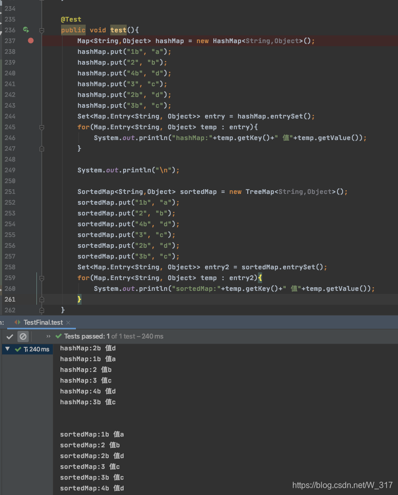 Map<String,Object> hashMap = new HashMap<String,Object>();hashMap.put("1b", "a");hashMap.put("2", "b");hashMap.put("4b", "d");hashMap.put("3", "c");hashMap.put("2b", "d");hashMap.put("3b", "c");Set<Map.Entry<String, Object>> entry = hashMap.entrySet();for(Map.Entry<String, Object> temp : entry){System.out.println("hashMap:"+temp.getKey()+" 值"+temp.getValue());}System.out.println("\n");SortedMap<String,Object> sortedMap = new TreeMap<String,Object>();sortedMap.put("1b", "a");sortedMap.put("2", "b");sortedMap.put("4b", "d");sortedMap.put("3", "c");sortedMap.put("2b", "d");sortedMap.put("3b", "c");Set<Map.Entry<String, Object>> entry2 = sortedMap.entrySet();for(Map.Entry<String, Object> temp : entry2){System.out.println("sortedMap:"+