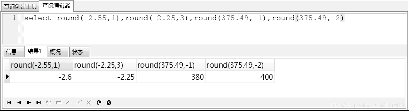 代码:select round(-2.55,1),round(-2.25,3),round(375.49,-1),round(375.49,-1)