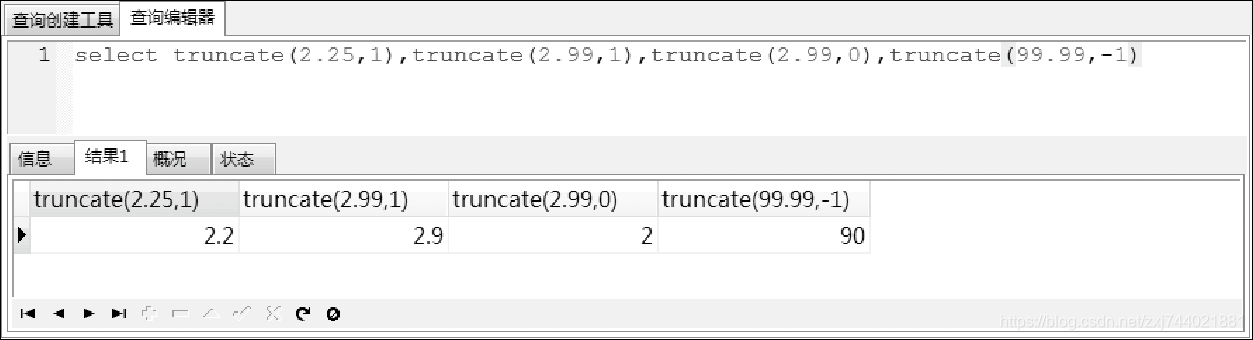 代码:select truncate(2.25,1),truncate(2.99,1),truncate(2.99,0),truncate(99.99,-1)