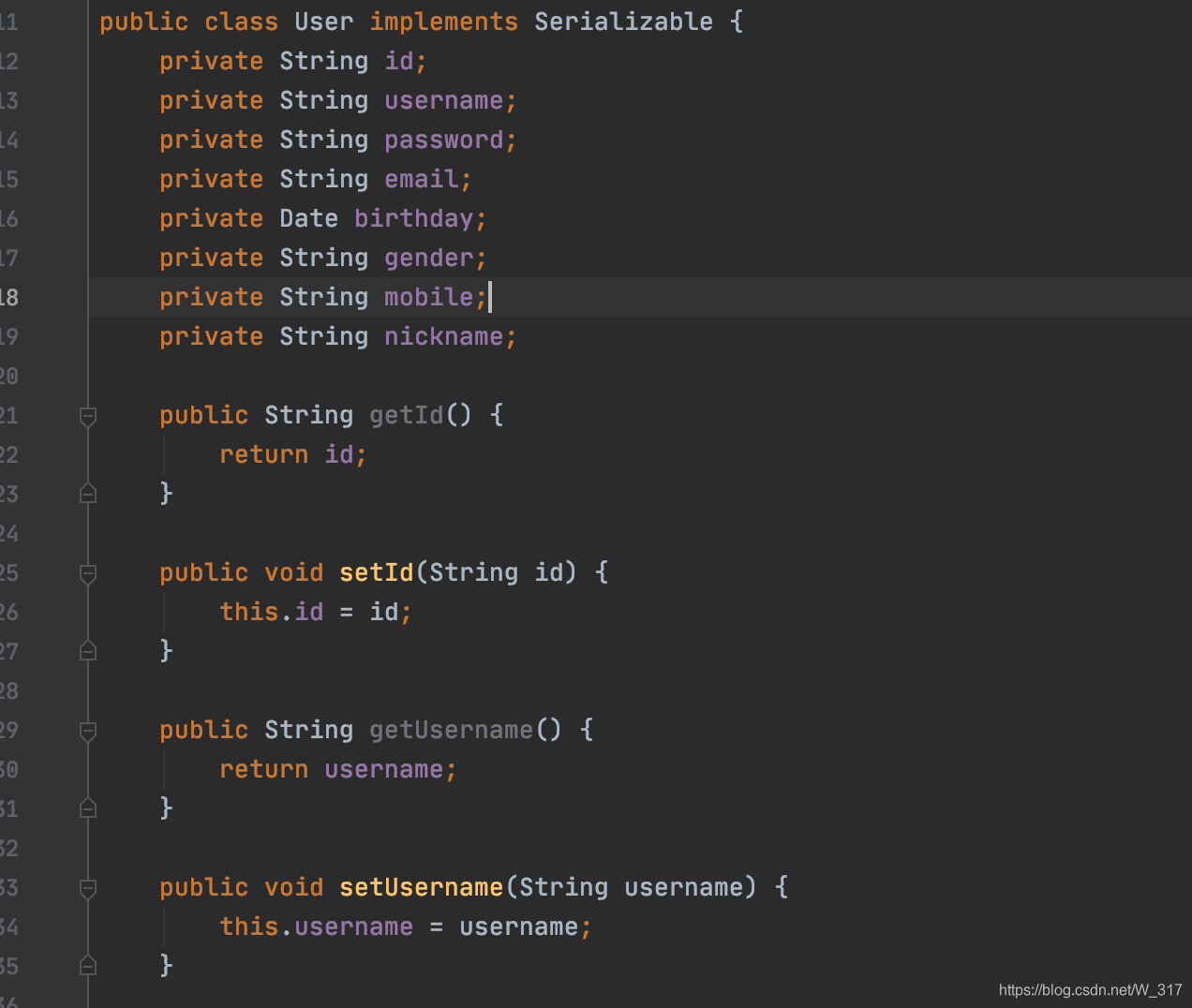public class User implements Serializable {private String id;private String username;private String password;private String email;private Date birthday;private String gender;private String mobile;private String nickname;public String getId() {return id;}public void setId(String id) {this.id = id;}public String getUsername() {return username;}public void setUsername(String username) {this.username = username;}public String getPassword() {return password;}public void setPassword(String password) {this.password = password;}public String getEmail() {return email;}public void setEmail(String email) {this.email = email;}public Date getBirthday() {return birthday;}public void setBirthday(Date birthday) {this.birthday = birthday;}public String getGender() {return gender;}public void setGender(String gender) {this.gender = gender;}public String getMobile() {return mobile;}public void setMobile(String mobile) {this.mobile = mobile;}public String getNickname() {return nickname;}public void setNickname(String nickname) {this.nickname = nickname;}}