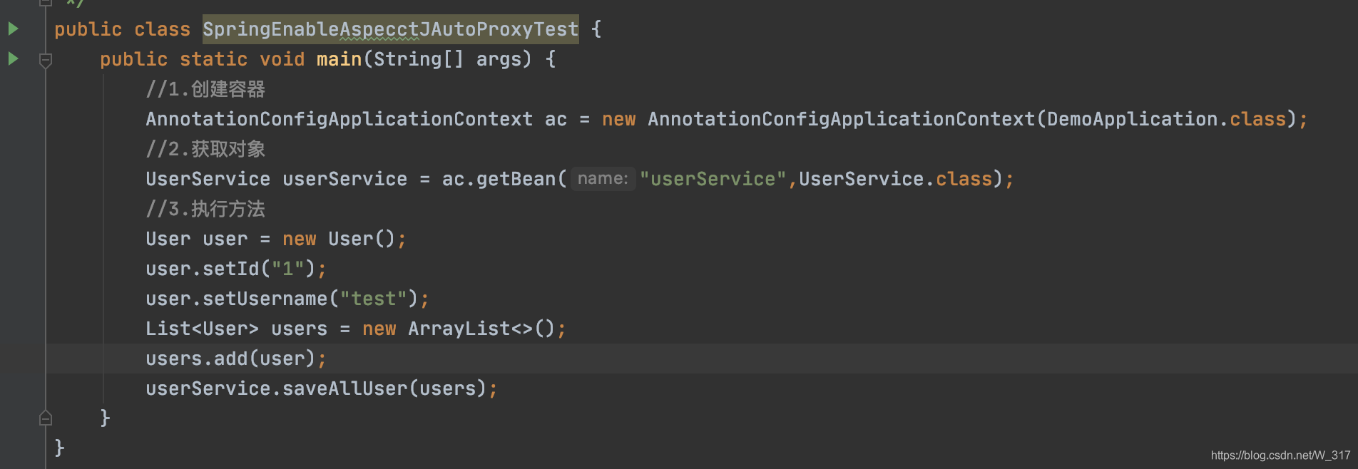 public class SpringEnableAspecctJAutoProxyTest {public static void main(String[] args) {//1.创建容器AnnotationConfigApplicationContext ac = new AnnotationConfigApplicationContext(DemoApplication.class);//2.获取对象UserService userService = ac.getBean("userService",UserService.class);//3.执行方法User user = new User();user.setId("1");user.setUsername("test");List<User> users = new ArrayList<>();users.add(user);userService.saveAllUser(users);}