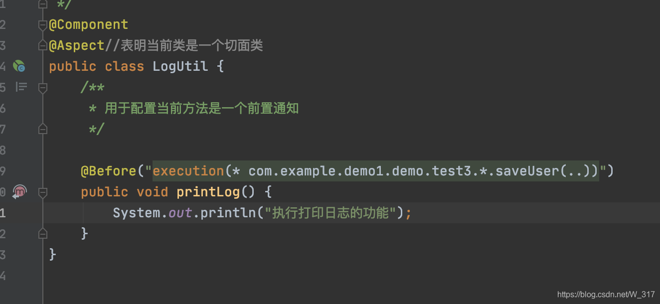 public class LogUtil {/*** 用于配置当前方法是一个前置通知*/@Before("execution(* com.example.demo1.demo.test3.*.saveUser(..))")public void printLog() {System.out.println("执行打印日志的功能");}