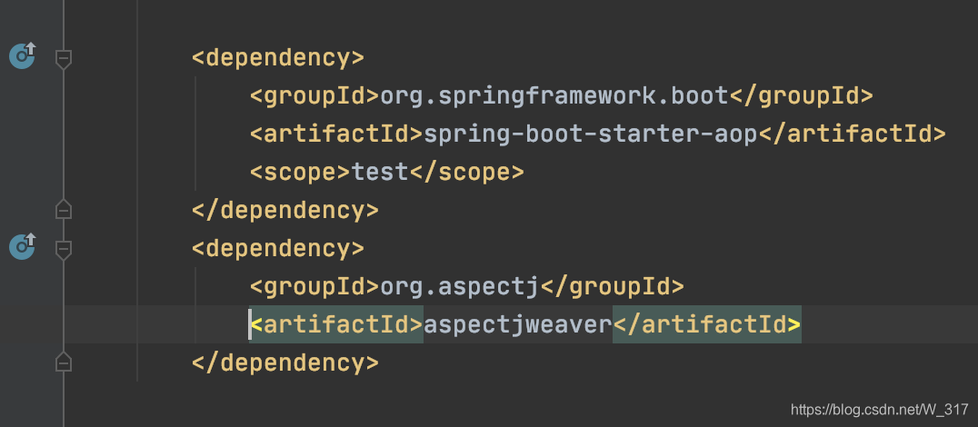 <dependency><groupId>org.springframework.boot</groupId><artifactId>spring-boot-starter-aop</artifactId><scope>test</scope></dependency><dependency><groupId>org.aspectj</groupId><artifactId>aspectjweaver</artifactId></dependency>