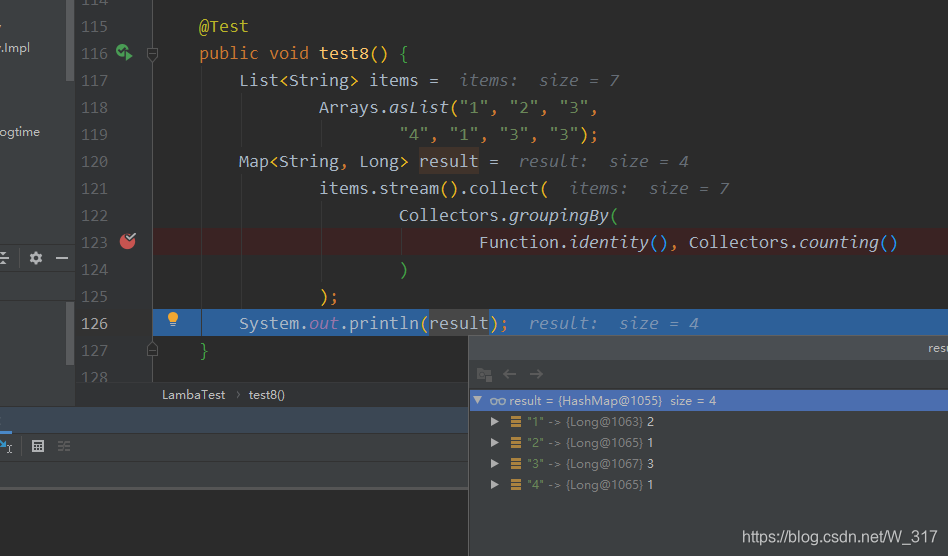 public void test8() {List<String> items =Arrays.asList("1", "2", "3","4", "1", "3", "3");Map<String, Long> result =items.stream().collect(Collectors.groupingBy(Function.identity(), Collectors.counting()));System.out.println(result);