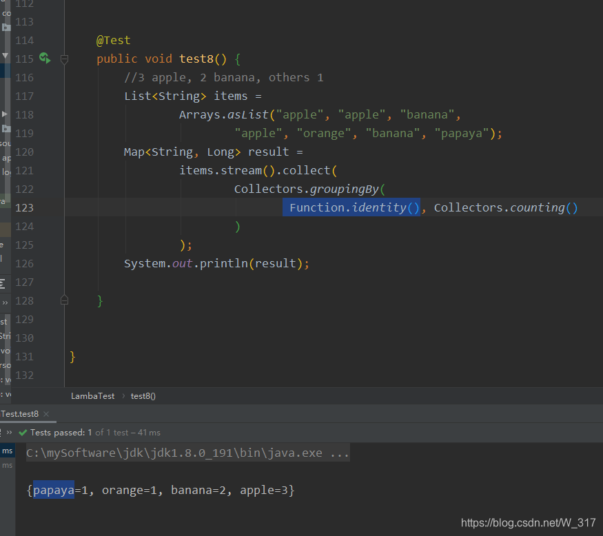 public void test8() {//3 apple, 2 banana, others 1List<String> items =Arrays.asList("apple", "apple", "banana","apple", "orange", "banana", "papaya");Map<String, Long> result =items.stream().collect(Collectors.groupingBy(Function.identity(), Collectors.counting()));System.out.println(result);}