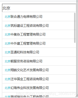 <!--示例<div class="rec" data-id="ABCY2FJcC4oMDw6Amd3Z1wgDzAvDSFjZnx%2FKB5QLz0wY35wARlUCY0%3D"><span class="highLight">北京</span>市北京饭店</div> --></div></div><!-- JS使用了H5的input propertychange即时反应-->$("#companyName").on("input propertychange",function(){winner_id = "";var count = $.trim(this.value).length;if(count > 100){this.value = this.value.substring(0,100);return;}if(count == 0){$("#search").addClass("disabled");$("#recList").hide();}else{$("#search").removeClass("disabled");getRecList(this.value);}});function getRecList(entName_key) {var baseUrl = getCtxUrl();$("#recList").html("");$.post(baseUrl+"/getH5CompanyAll",{"companyName":$("#companyName").val()},function(r){if(r){if(typeof (r)!="undefined"){var recList = r;for(var i=0;i<recList.length;i++){var entName = recList[i].companyName;// var id = recList[i]._id;if(entName!="" && entName.length>20){entName = entName.substr(0,20)+"...";}var obj=$("<div class='rec' data-id='' style='text-align: left;'>"+entName.replace(entName_key,"<span class='highLight'>"+entName_key+"</span>")+"</div>");$("#recList").append(obj);}}}$("#recList").show();$(".rec").click(function(){if($(this).text()!=""){$("input").val($(this).text());// winner_id = $(this).attr("data-id");$("#recList").hide();}});});