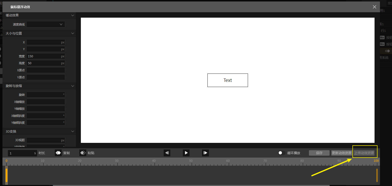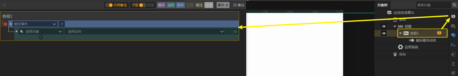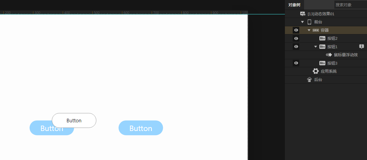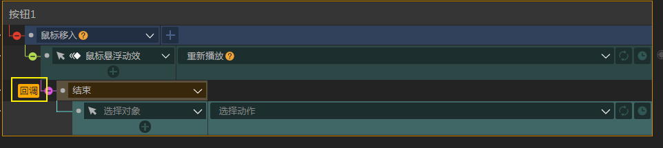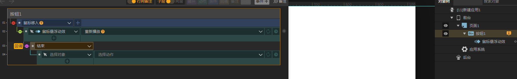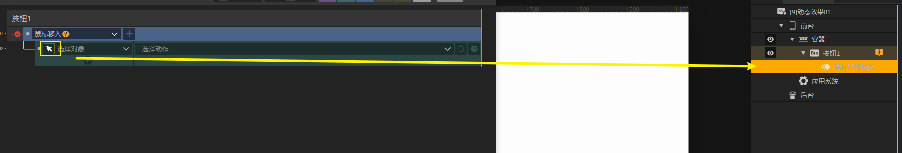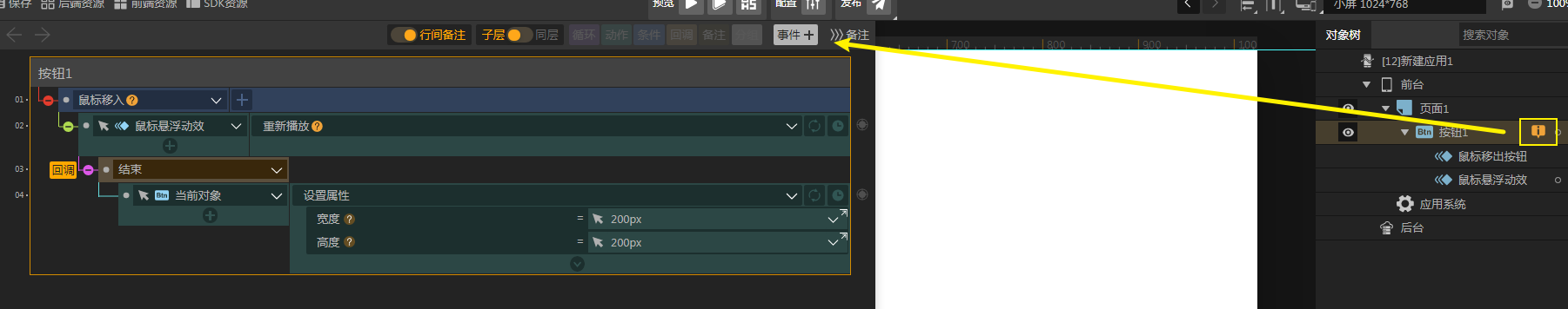在上一节中,我们创建了一个动效,但是并没有使用,在此我们给按钮设置一个悬浮事件,当鼠标悬浮在按钮之上后就调用该动效,点击按钮添加事件: