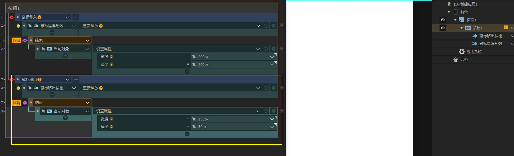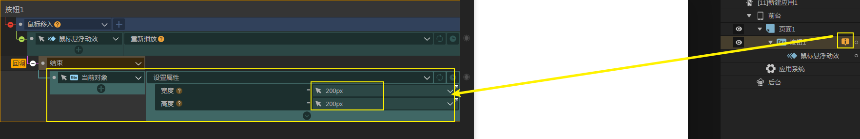 在这里只需要在动效播放完毕后,在对应的动作中设置当前按钮的宽高即可,预览之后效果如下: