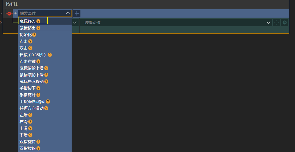 点击按钮添加事件后将会出现一个事件编辑框,在事件编辑框中,选择触发时间为鼠标移入: