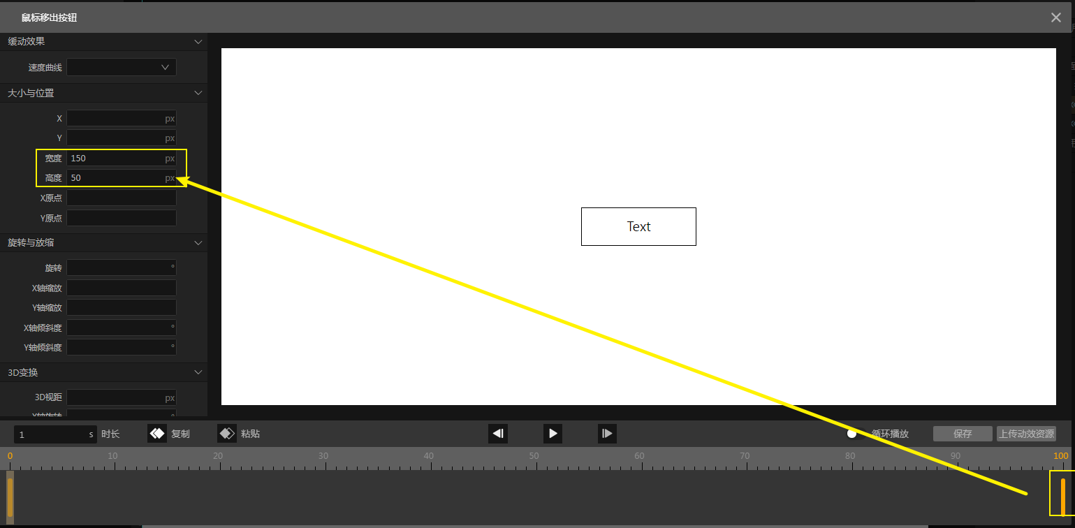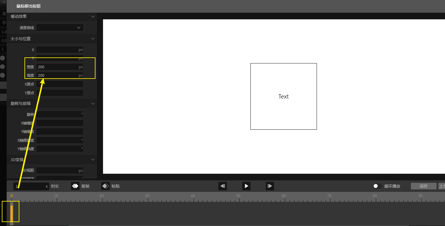 此时当鼠标移出并不会使其大小恢复,只需要增加一个动效,设置鼠标移出时返回其大小即可,首先编辑动效,设置初始关键帧为变化时的宽高: