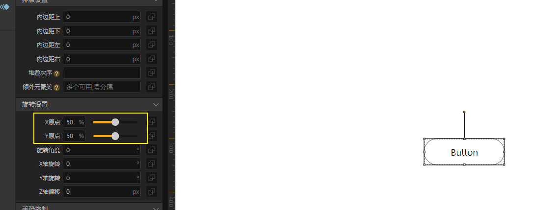 这是由于该组件的原点(绘制点需要设置,默认是左上角),此时更替为中心即可,点击按钮,在属性面板中找到中心点,设置为垂直与水平都在 50% 处即可: