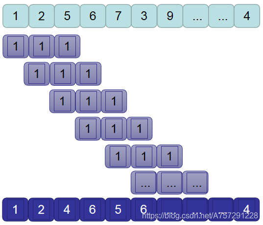 以下是一个基本卷积的图示,第一列是一维数组中每一个位置的值。其中111我们称为卷积核。通过卷积核与一维数组进行计算最终将会得到蓝最下面的蓝色方块内的值。第一位我们照着写下,蓝色区域为1,蓝色方块内的第二个值为2,是如何得到的呢?很简单,用卷积核的每一个数乘上淡青蓝色的内容,那就是11,21,15,随后将它们进行相加,除以卷积核的步长,也就是3。这是就可以写成(11+21+15)/3等于2,余数为2,我们只取整数部分。之后的计算也是如此,包括二维的数据进行计算也是根据一维的计算原理一致。