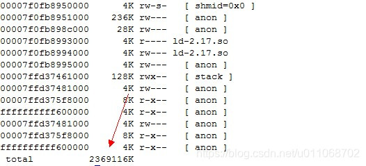 我们先pmap 26858试下,部分效果如下,我们知道内存映射所占空间大小是2369116K