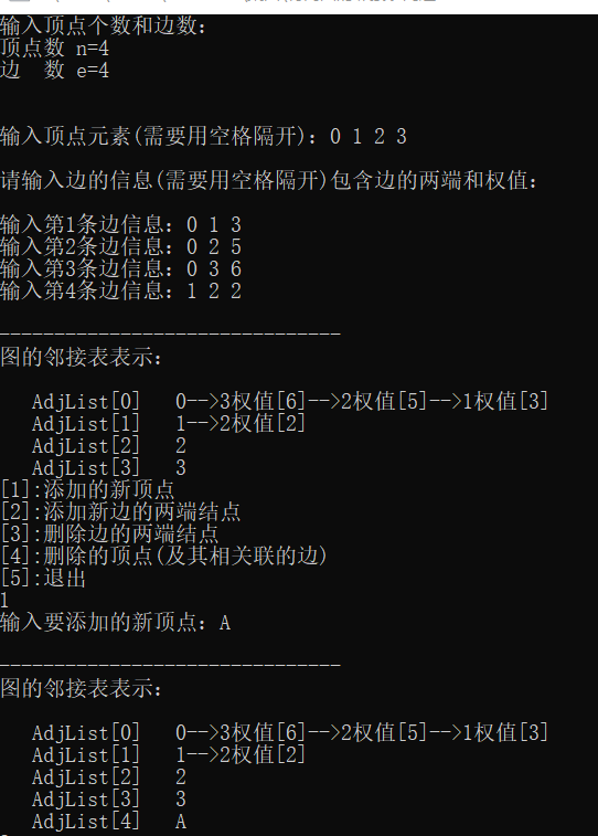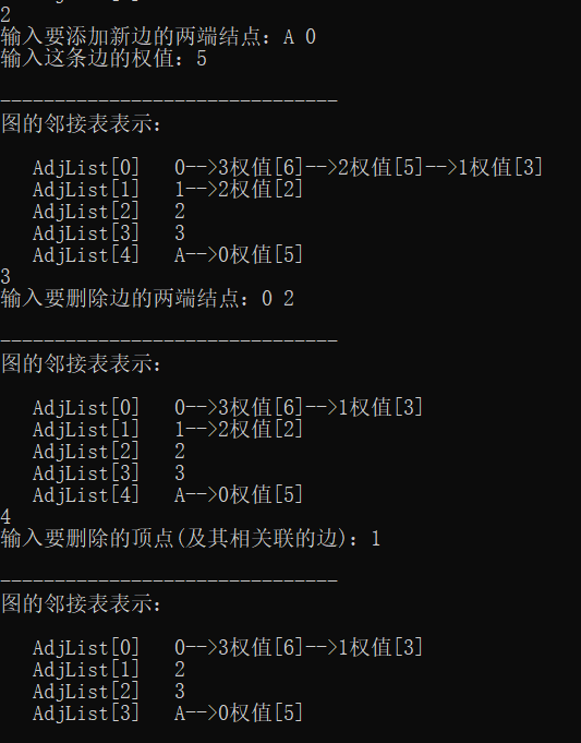{int i=0;int j=1;VertexType v,w;printf("[1]:添加的新顶点\n");printf("[2]:添加新边的两端结点\n");printf("[3]:删除边的两端结点\n");printf("[4]:删除的顶点(及其相关联的边)\n");printf("[5]:退出\n");while(j){scanf("%d",&i);switch(i){case 1:printf("输入要添加的新顶点:");getchar();scanf("%c",&v); InsertVex(G,v);print(*G);break;case 2:printf("输入要添加新边的两端结点:");getchar(); scanf("%c %c",&v,&w); InsertArc(G,v, w);print(*G);break;case 3:printf("输入要删除边的两端结点:");getchar();scanf("%c %c",&v,&w); DeleteArc(G,v, w);print(*G);break;case 4:printf("输入要删除的顶点(及其相关联的边):");getchar();scanf("%c",&v); DeleteVex(G,v);print(*G);break;case 5:j=0;break;} }}