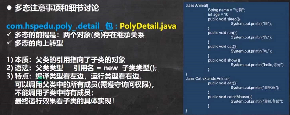 - 可以调用父类中的所有成员(需遵守访问权限),但是不能调用子类的特有的成员,因为在编译阶段,能调用哪些成员,是由编译类型来决定的