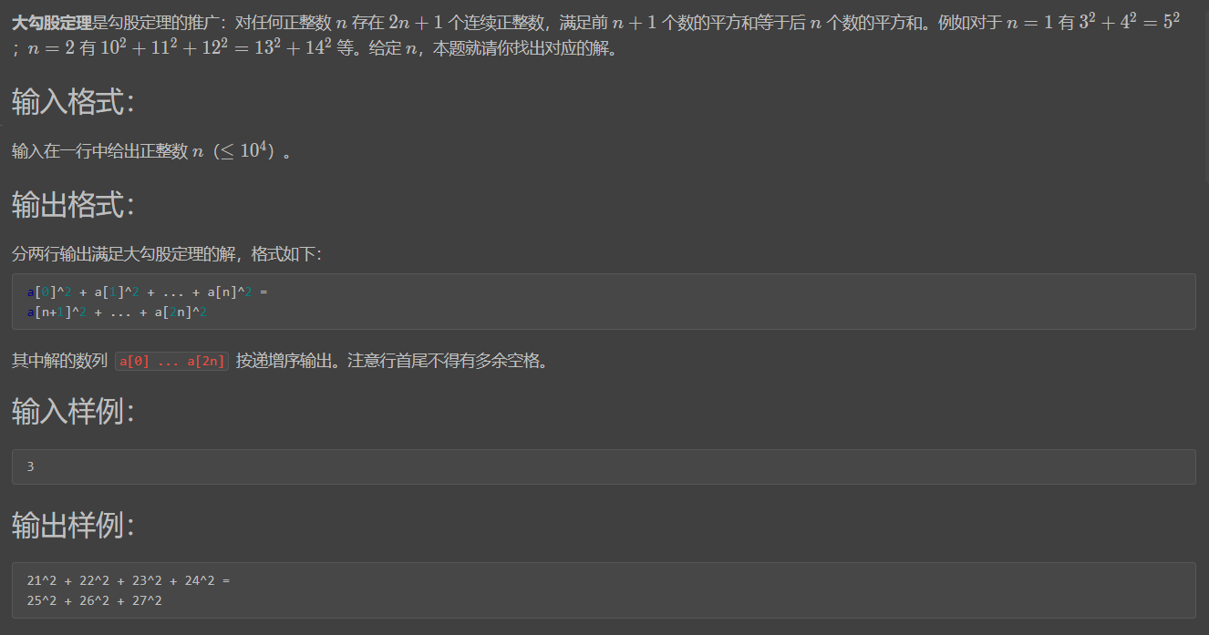 {for(int i = 1; i <= 50000; i++)num[i] = i*i;int n;cin >> n;int res, i = 0;int l, r;while(1){l = 0, r = 0;for(int j = 1; j <= n+1; j++)l += num[i+j-1];for(int j = i+n+1; j <= i+n+n; j++)r += num[j];if(l == r){res = i;break;}i++;}for(int i = 1; i <= n+1; i++){if(i > 1)printf(" + ");printf("%d^2", res+i-1);}printf(" =\n");for(int i = 1; i <= n; i++){if(i > 1)printf(" + ");printf("%d^2", res+n+i);}return 0;