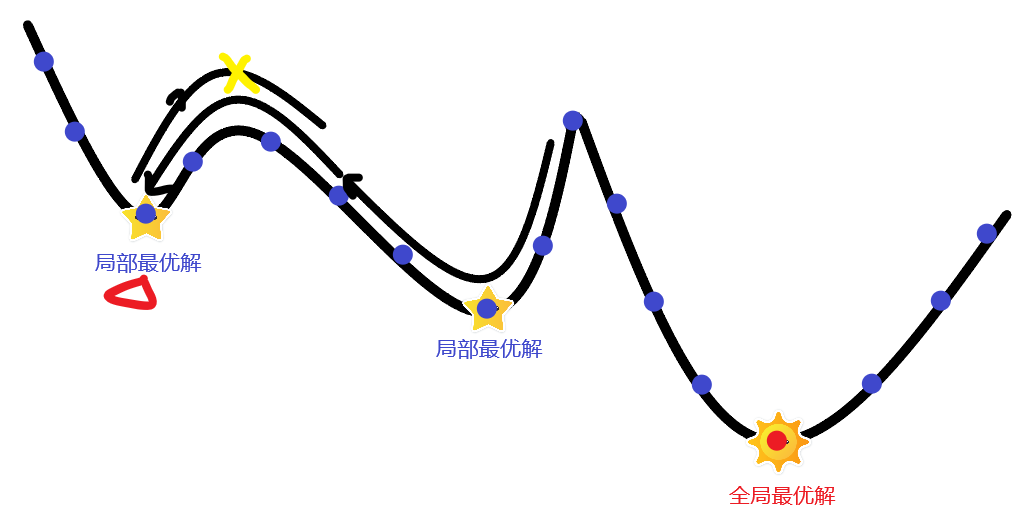 显然如果存在多个”转折“时,爬山就很容易进入局部最优解,而非全局最优解。