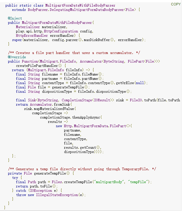 public Result upload() {MultipartFormData<TemporaryFile> body = request().body().asMultipartFormData();MultipartFormData.FilePart<TemporaryFile> picture = body.getFile("picture");// 直接转成File,然后进行处理File file = (File)picture.getFile();// 也可以通过下边的方式进行操作if (picture != null) {String fileName = picture.getFilename();long fileSize = picture.getFileSize();String contentType = picture.getContentType();TemporaryFile file = picture.getFlie();file.copy(new File(“路径”));return ok("File uploaded");}}