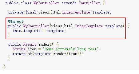 在模板顶部使用 @this(args) 语法声明构造函数,可以将twirl模板生成为类而不是静态对象。这意味着twirl模板可以直接注入到控制器中,并且可以管理它们自己的依赖项。例如:模板需要依赖Summarizer