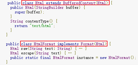 需要先写一个自定义格式类,此类继承BufferedContent<T>抽象类,之后写一个转换类,用来定义文本的集成过程,此类实现play.twirl.api.format接口。下边举一个例子: