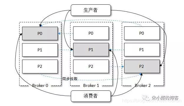 在 Kafka 集群中有 3 个分区,每个分区有 3 个副本,正好均匀地分布在 3个 broker 上,灰色阴影的代表 leader 副本,非灰色阴影的代表 follower 副本,虚线表示 follower 副本从 leader 副本上拉取消息。当生产者写入消息的时候都写入 leader 副本,对于图 8-23 中的 情形,每个 broker 都有消息从生产者流入;当消费者读取消息的时候也是从 leader 副本中读取 的,对于图 8-23 中的情形,每个 broker 都有消息流出到消费者。