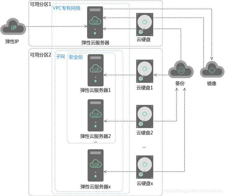 - 弹性云服务器在不同可用区中部署(可用区之间通过内网连接),一个可用区发生故障后不会影响同一区域内的其它可用区。