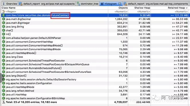 由这段代码可知,大量的FutureContract和BigDecimal(说明:因为FutureContract中有多达16个BigDecimal类型的属性),FutureContract占了120MB,BigDecimal占了95MB。那么就可以断定问题是与FutureContract相关的代码造成的,如果是正常的JVM示例,Histogram试图最占内存的是byte[]和char[]两个数组,两者合计一般会占去80%左右的内存,远远超过其他对象占用的内存。
