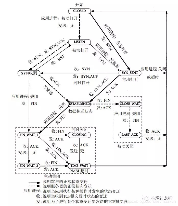 TCP 是一个面向连接的协议。无论哪一方向另一方发送数据之前,都必须先在双方之间建立一条连接。连接创建与终止的状态变化图如下: