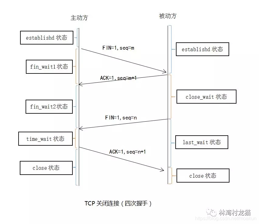 主动方想要关闭连接,发送 FIN 包给被动方,序号为 m