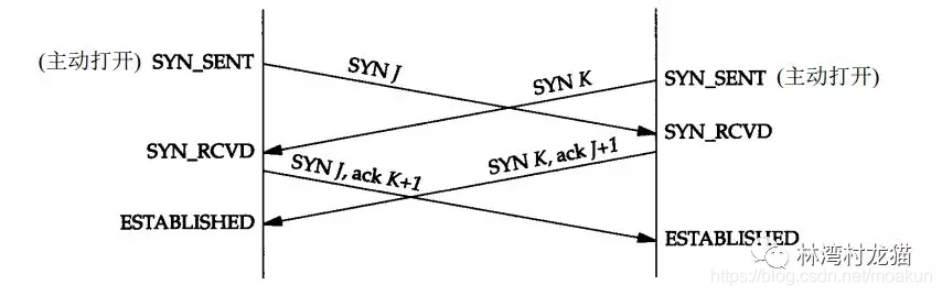 两个应用程序同时彼此执行主动打开的情况是可能的。每一方必须发送一个 SYN,且这些 SYN 必须传递给对方。这需要每一方使用一个对方熟知的端口作为本地端口。同时打开的状态迁移图不同于正常状态的三次握手,该情况下需要进行 4 次握手。如图: