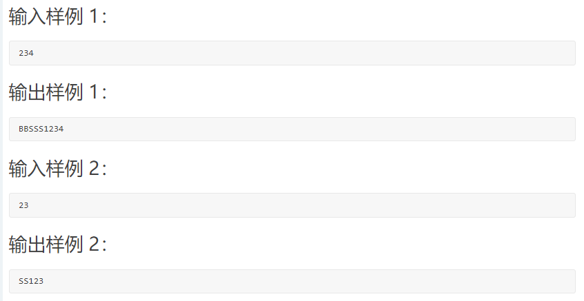 例如 234 应该被输出为 BBSSS1234,因为它有 2 个“百”、3 个“十”、以及个位的 4。