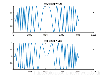 信号的调频斜率K=100000,持续时间T=20.6ms,采样速率fs{{f}_{s}}fs=10080,采样周期Ts=1/fs{{T}_{s}}=1/{{f}_{s}}Ts=1/fs,信号带宽B=2KT=4.12kHzB=2KT=4.12kHzB=2KT=4.12kHz。设接收信号r(t)r(t)r(t)由2路多径信号构成,其参数分别为