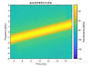 钟形函数g(t)g(t)g(t)的时域波形如图1所示,线性调频信号s(t)s(t)s(t)的实部、虚部的时域波形如图2,线性调频信号的时频图如图3所示。